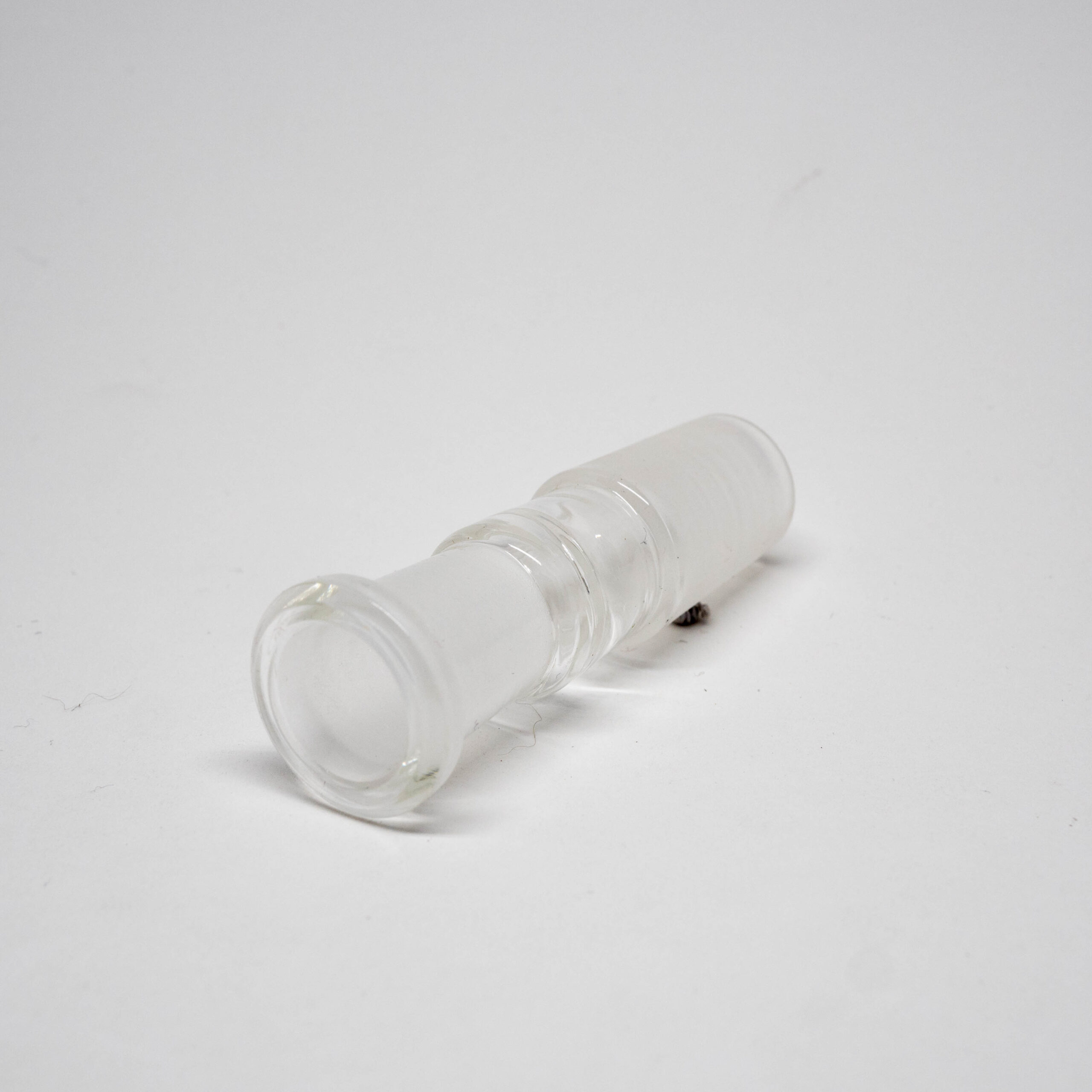 Wykonana ze szkła przejściówka pozwalająca na wpięcie elementu ze szklanym szlifem GONG 14,5 mm typu męskiego (np. adaptera do waporyzatora) do szlifu 18,8 mm typu żeńskiego (np. fajki wodnej).