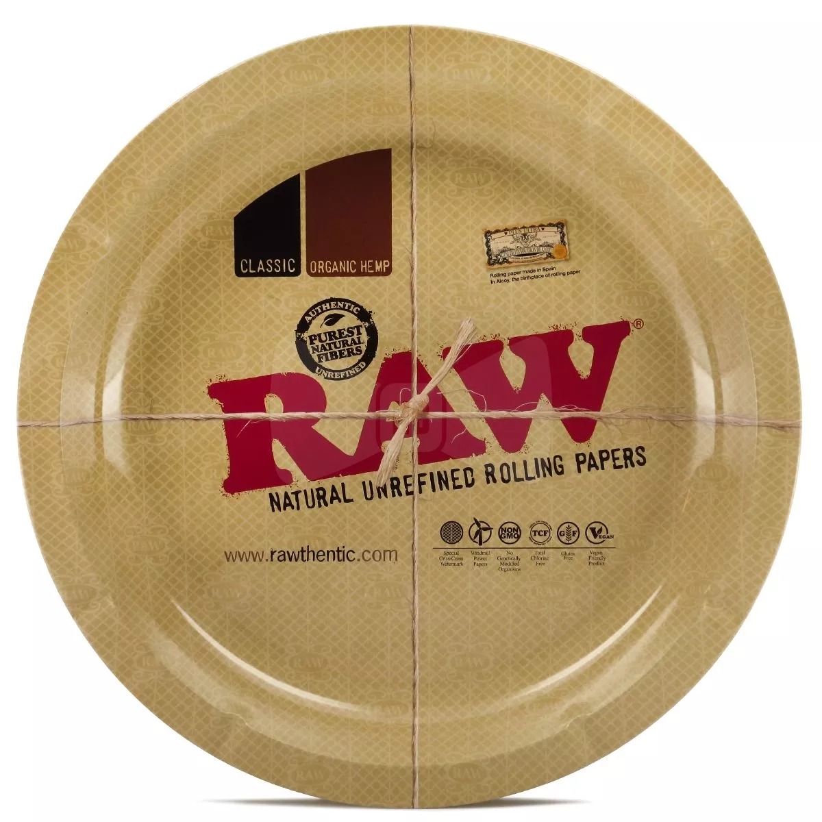 Okrągła, metalowa tacka na susz z kultowej serii RAW Classic umożliwiająca wygodne do opróżniania młynka ze zmielonego suszu lub wysypania zużytego materiału roślinnego z komory waporyzatora.